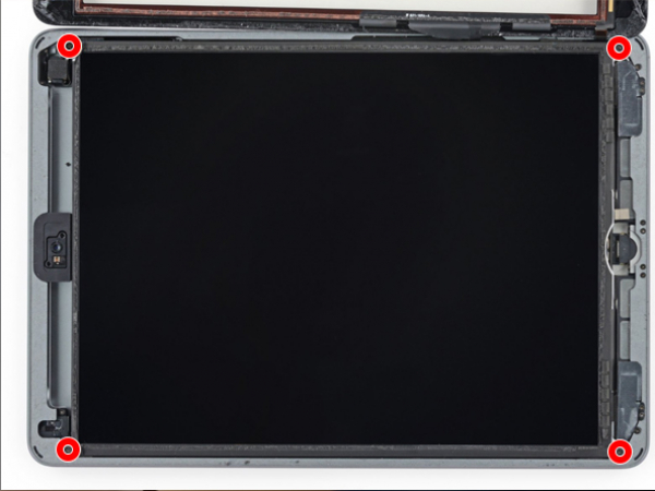 - Fjern de fire Philips-skruer i hvert hjørne af LCD-skærmen. - De to skruer i toppen er skjult af sort tape. - Løft et af hjørnerne af LCD-skærmen op for at starte fjernelsen. - Vær forsigtig, da nogle af kablerne stadig er tilsluttet. - Fjern metalcoveret ved at skrue de tre Phillips-skruer ud. - Løft metalcoveret op ved hjælp af værktøjet. - Afbryd resten af digitizerkablerne.