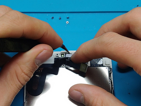 Lirk under den venstre kant på hjem-knappens kabel, for at frakoble det fra sit stik.