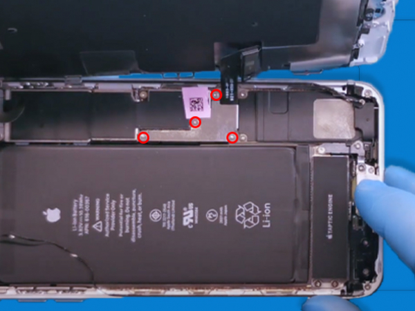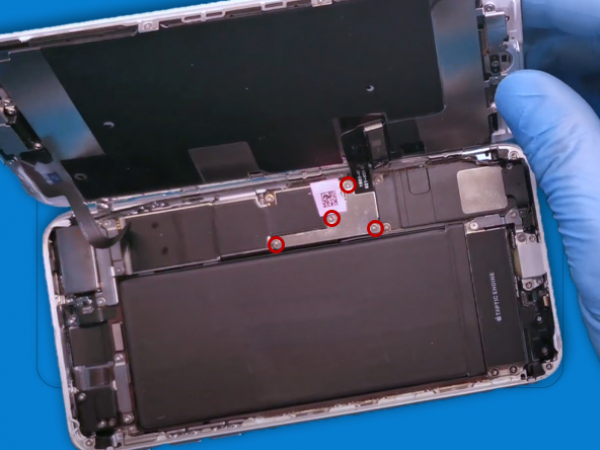 - Fjern de fire Phillips-skruer, der fastgør den nederste LCD-skærm kabelbeslag: - Fjern skruerne, der fastgør skærmstiksbeslaget, og fjern beslaget. - Brug forsigtigt en spudger til at afmontere batteristikket, løft digitaliseringskabelkontakten op fra stikket. - Løft kablet, indtil det skilles. Tip: - Hold styr på hver enkelt skrue, så du kan sætte dem tilbage hvor de hører til, så du undgår at beskadige din iPhone.
