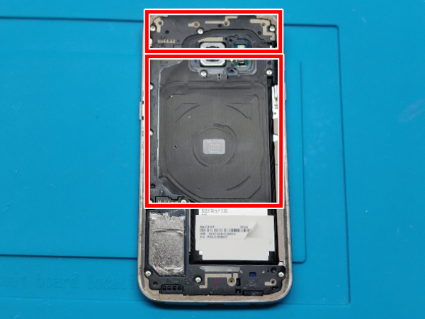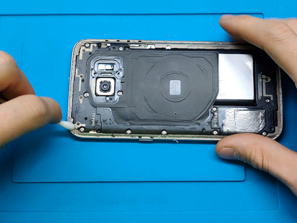 • Når bagside glasset skal sættes på igen, bruges den klæbende dobbeltsidede tape, som også blev brugt til batteriet.