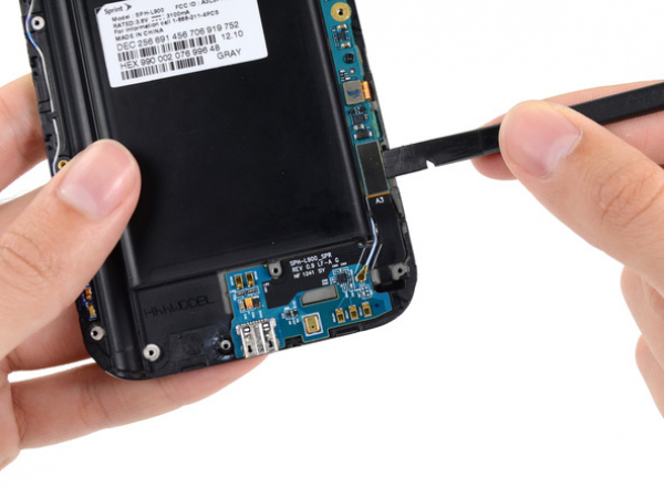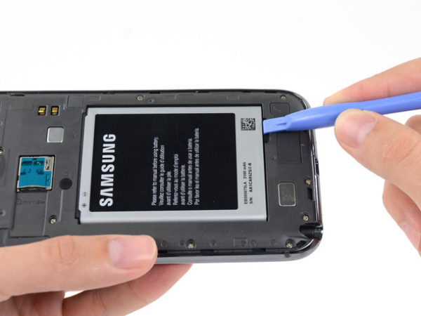 • Brug et plastikåbningsværktøj for at løfte batteriet ud og op af coveret. Du sætter værktøjet i fordybningen over batterirummet for at gøre det.