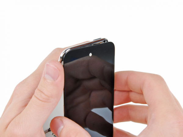 När det finns tillräckligt med utrymme för att få tag på frontpanelens nedre del, lyftes den bort från Touch hölje för att få bort limmet längs dess vänstra och högra sidor.