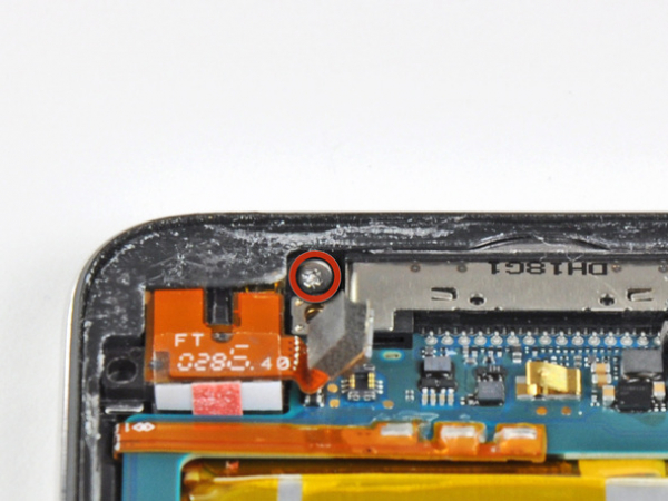 Displaykabeln är också mycket kort och är ansluten till logikkortet nära toppen av den främre panelen. Om den inte lossnar frigör samtidigt den övre delen av frontpanelen, och ta försiktig bort den med vårt öppningsverktyg innan du vrider ur Touch främre panel.