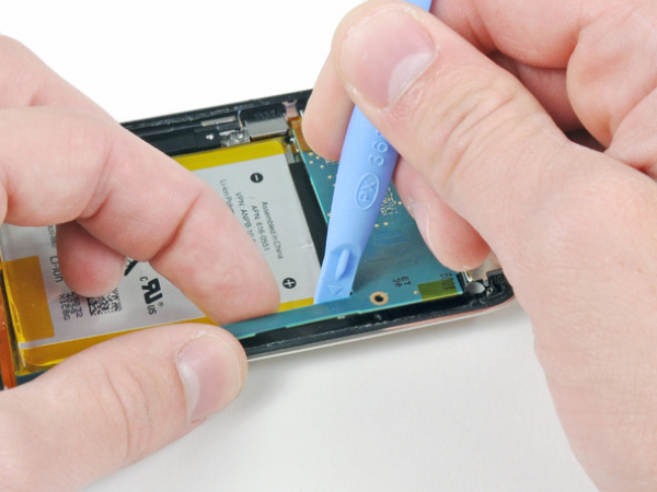 Använd vårt öppningsverktyg för att försiktigt lyfta upp änden av hörlursuttaget närmast batteriet ur dess fördjupning.