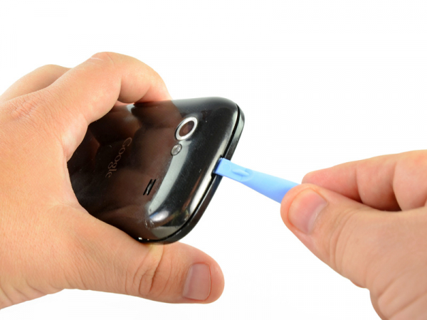 • Sätt in försiktigt vårt öppningsverktyg mellan den bakpanelen och den inre bakramen nära bakåtvända kameran.