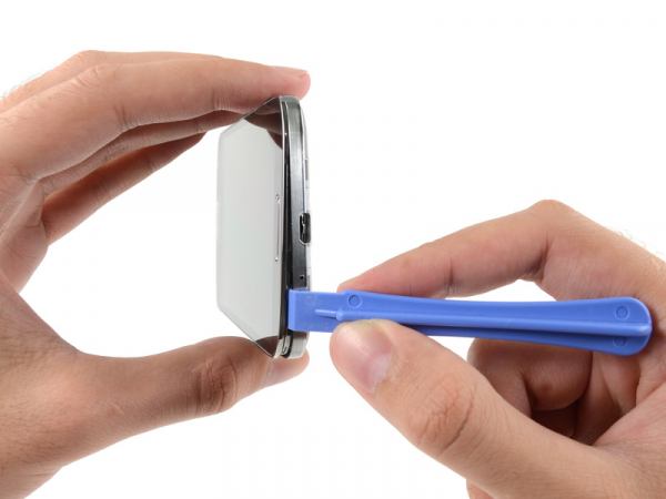 Genom att börja på sidan av telefonen vid volymknappen, sätt ditt öppningsverktyg mellan kromkanten och displayglasets baksida.