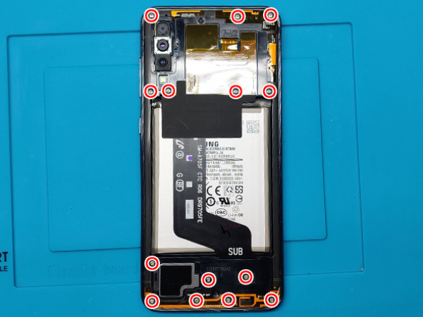 Ta loss alla fjorton Phillips #00 skruvarna som fäster mobilens mittram.
