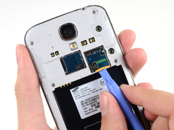 Sätt i vårt öppningsverktyg, eller fingret, i skåran på batterifacket och lyft ut batteriet uppåt.