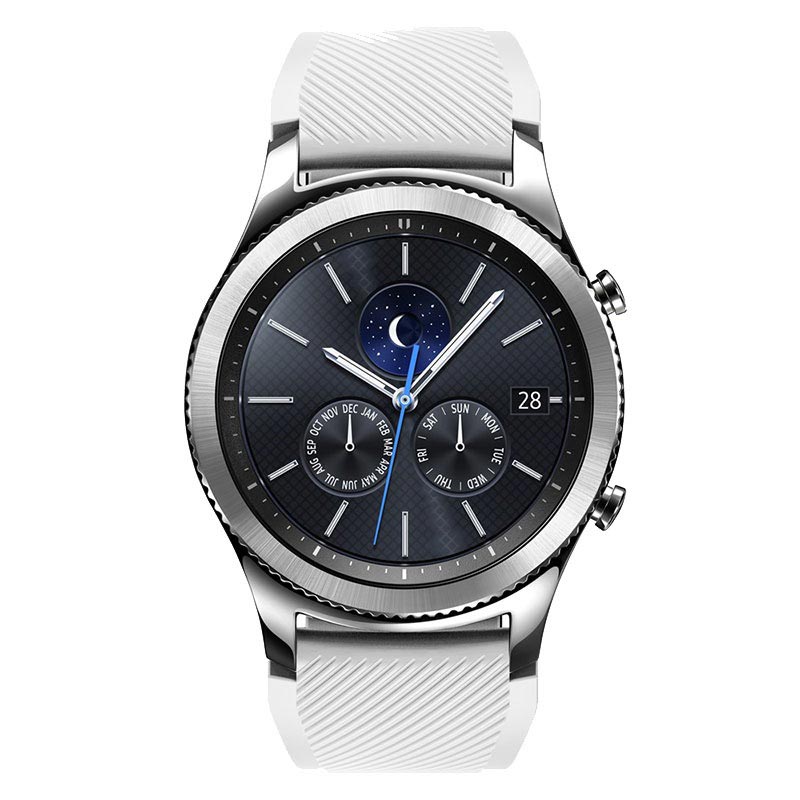 • Ideal for the sporty type, the silicone wristband for Samsung Gear S3 is flexible, lightweight and comfortable on the wrist. The durable and wear-resistant band boasts a classic metal buckle on the back and a textured surface.